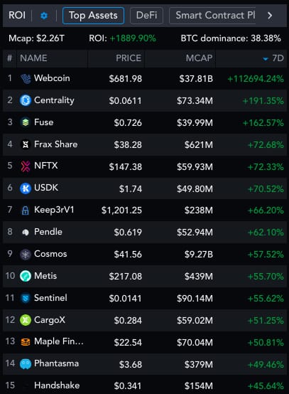 And here are the top 15 performers in the last week from all tokens with a market cap of $20M+.