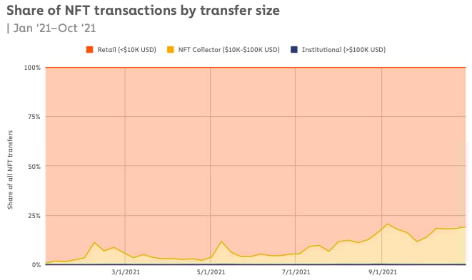 "However, as we see above, larger NFT transactions are becoming more and more common. As of the week of October 31, 2021, NFT collector-sized transactions, meaning those between $10,000 and $100,000 worth of cryptocurrency, have risen to account for 19% of all NFT transactions, compared to just 6% at the beginning of March. With an average number of just under 500 per week, institutional-sized transactions account for well under 1% of all transfers."
