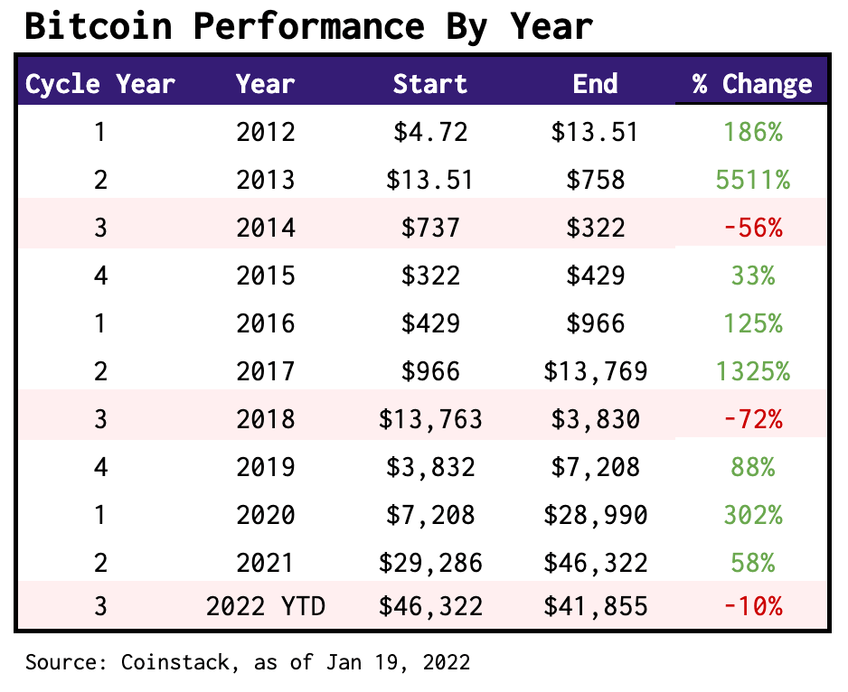 However, both Bitcoin (BTC) and Ether (ETH) are currently ~35% off from their November 2021 highs. Historically, the 3rd year after a Bitcoin having (the last one was in May 2020, so this is year 3 in the cycle) has been the worst year for digital asset prices. This usually happens because after the supply crunch at the time of the halving the price increases in the following 12-18 months, eventually into a speculative area — then comes tumbling back to Earth in year 3 of the cycle — correcting from prior irrational exuberance.