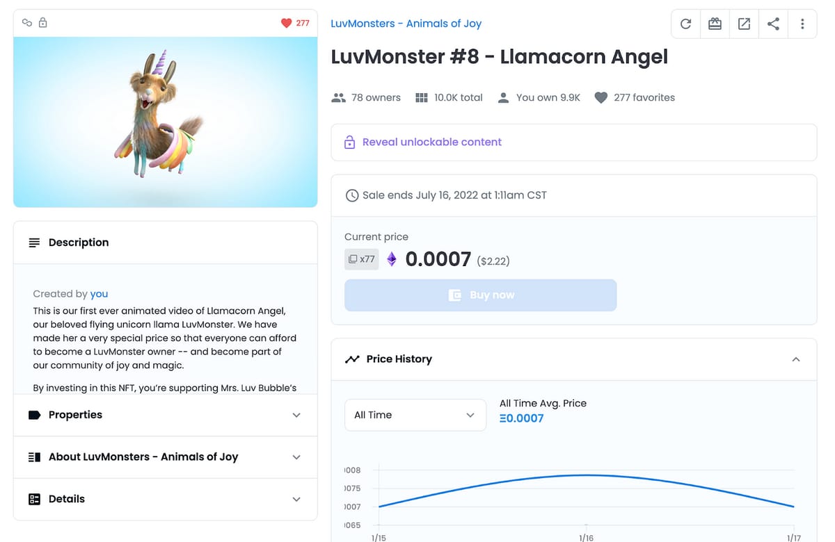 We also launched our first ever video NFT LuvMonster - Llamacorn Angel complete with light language sound (watch the video -- it will make you smile). She’s available for just $2.22 as our goal is to first build up our unique collector base to 1,000 collectors, then to increase the price floor as we get the secondary sales and trading going. We’ve sold 133 copies of her so far. If we can sell 1,250 we will have enough to start our animated LuvMonster series. Thanks for helping us bring joy and smiles to the world!!