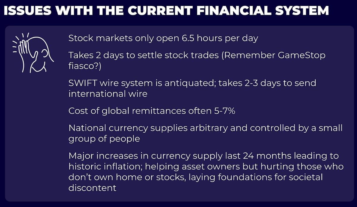 Existing financial market systems remain rather broken. It still takes 2 days to send an international wire on the SWIFT system. It still takes 2 days to settle an equities trade. Traditional markets are only open 6.5 hours per day, 5 days per week. The world needs better financial technology that can deliver 24/7 markets -- and that is being delivered through asset tokenization and blockchain technology. Soon enough, all financial assets will be tokenized and trade on transparent blockchains -- equities, bonds, and real estate included.