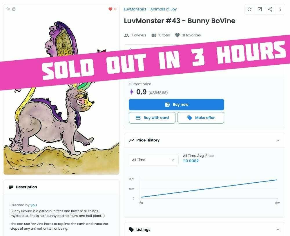Last week, Mrs. Bubble launched three new NFTs. She sold out of 10 copies of LuvMonster #43 - Bunny BoVine for a special $2 early buyer price within three hours. Bunny BoVine then resold in the aftermarket for 0.06 ETH ($189), earning an early buyer a very nice profit -- and is now listed at $2817.
