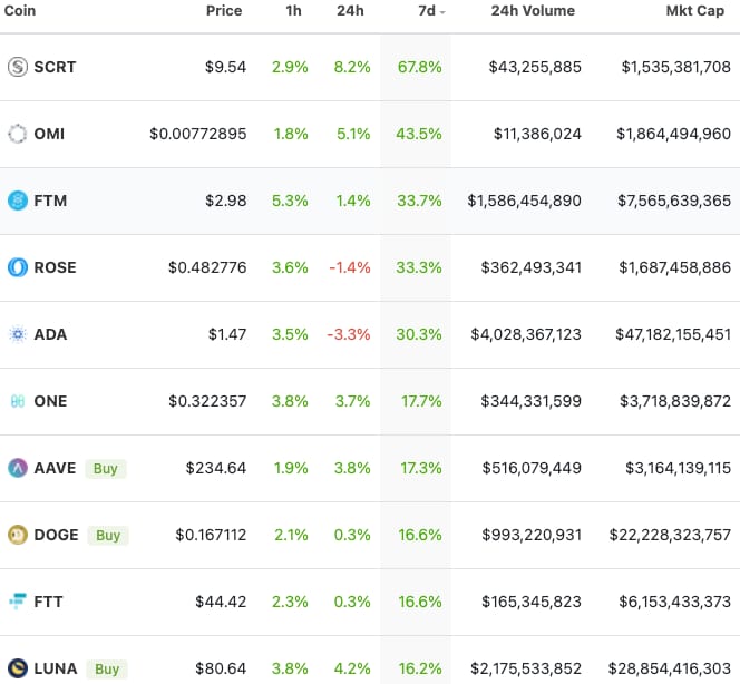Here are the top 10 performing digital assets this week, out of the top 100 by market cap. Some of our favorites like SCRT, FTM, and AAVE had an especially great week.