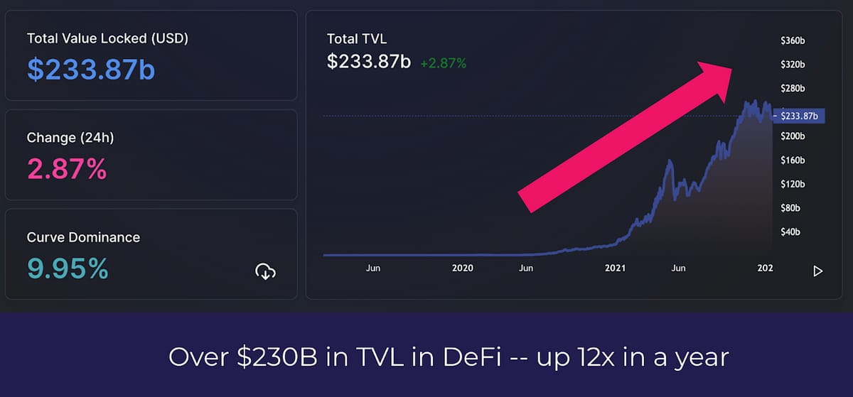 The amount of total value locked in DeFi (crypto’s killer app) is now over $230B. This is up from $0 four years ago. There is real utility now (DeFi, web3, payments, NFTs, gaming) in crypto while four years ago it was simply too early.