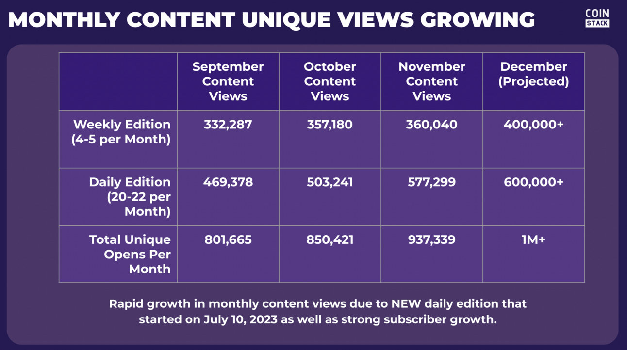 As one of the largest weekly institutional crypto newsletters, we are now up to 200,000 weekly subscribers and receive over 80,000 unique opens per issue. We also send out Coinstack Daily to 60,000 subscribers. We’d love to get your brand in front of our audience of crypto industry insiders, fund managers, institutional investors, app developers, crypto VCs, and accredited investors. If you’re interested in getting additional exposure for your brand in 2024, please view our Coinstack Sponsor Deck and set up a call to discuss here.