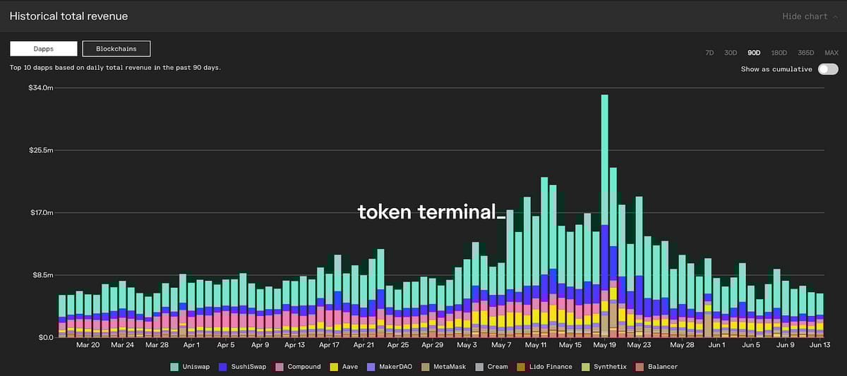 So what’s earning all this money? The top apps by revenue over the last 30 days are Uniswap, SushiSwap, Aave, Compound, and Metamask, and Maker.