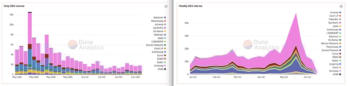 We can see from the Daily/Weekly DEX volume that across the board volume has been on a steady decline since May 18. What’s also worth noting is that Uniswap has maintained dominance and managed to compress on average much less to its competitors.