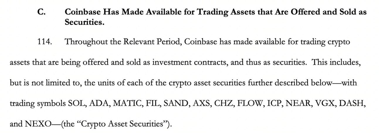 ⚖️ SEC names more tokens as securities, including Chiliz, Flow, Near and Nexo-The SEC reiterated its stance that well-known crypto assets, including Solana, Cardano and Polygon, are securities under U.S. law in a lawsuit against Coinbase — while adding further tokens to the list as well.