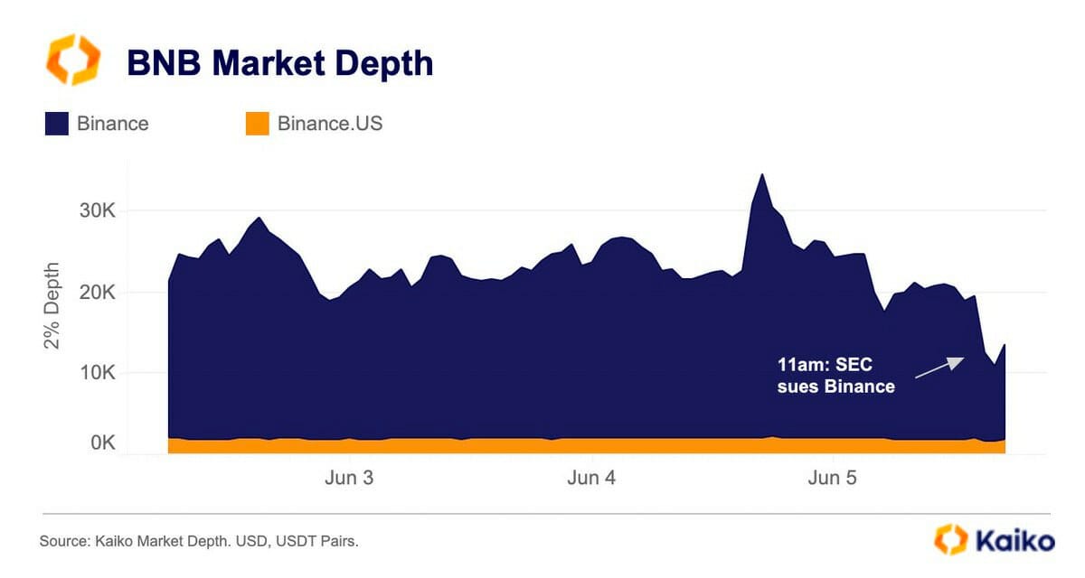 5. BNB market depth on Binance has more than halved since news of the SEC lawsuit.