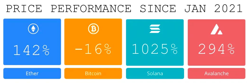 Price performance on major L1 tokens since we began writing Coinstack in January 2021