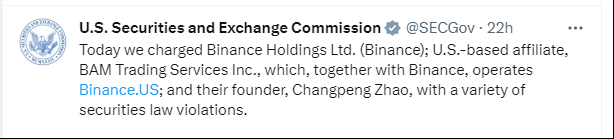 ⚖️ US SEC sues Binance, CEO Zhao for breaking securities rules- The U.S. Securities and Exchange Commission has sued Binance Holdings Ltd. and CEO Changpeng Zhao, citing a federal court filing. The suit accused them of breaking U.S. rules, Bloomberg said."Our team is all standing by, ensuring systems are stable, including withdrawals, and deposits," Zhao said on Twitter. "We will issue a response once we see the complaint. Haven't seen it yet. Media gets the info before we do."