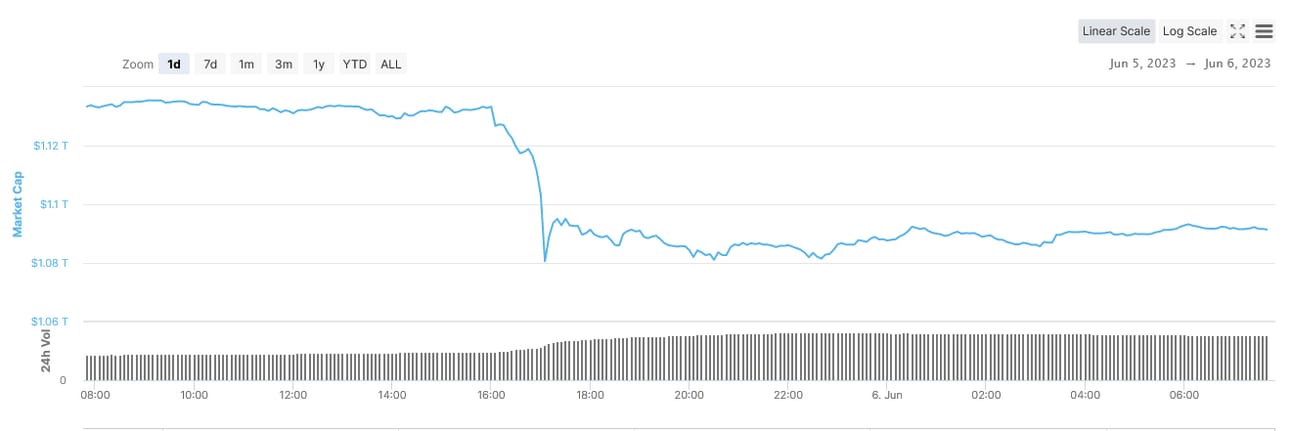 ⚖️ SEC-induced panic saw $53 billion wiped from crypto market- The total crypto market cap fell $53 billion as news of the U.S. Securities and Exchange Commission (SEC) filing against Binance came through. On June 5, the SEC charged Binance, its CEO Changpeng Zhao, and related entities with 13 violations, including wash trading, evasion of regulations, and offering unregistered securities.