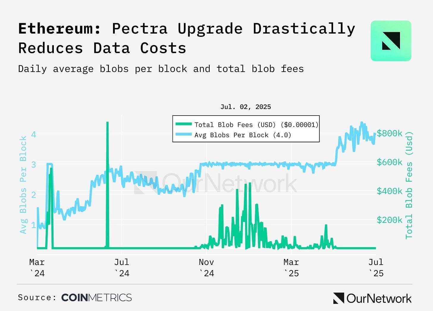 The Pectra upgrade went live in May, enhancing Ethereum’s staking efficiency and L2 scalability. 35.5M ETH, or 29.4% of supply, is now staked. EIP-7691 raised the blob target from 3 to 6, doubling blob capacity. This has reduced data costs, and enabled greater rollup transaction throughput and adoption.