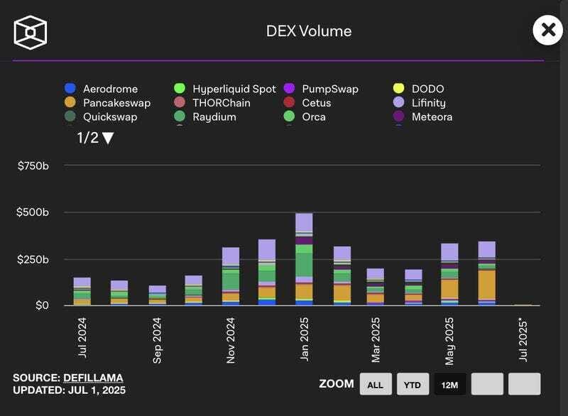 1. PancakeSwap led all DEXs in total monthly volume for the second straight month, accounting for 45% ($153B) of all DEX volume in June. The protocol shattered its previous record from May ($98B), growing 56% month-over-month.