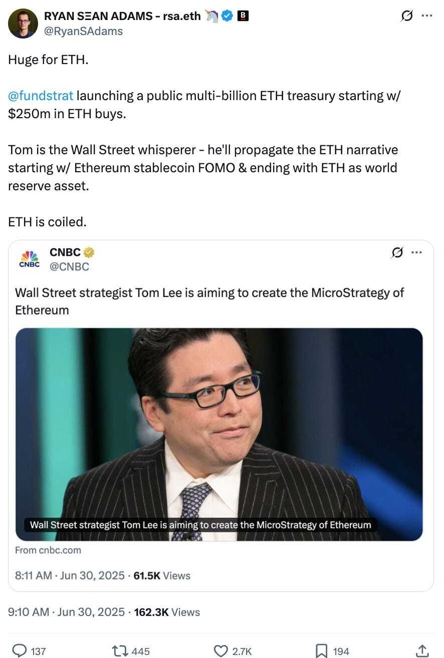 🎉 BitMine Immersion Stock Triples as It Raises $250M for Ether Treasury, Adds Thomas Lee to Board: BitMine Immersion Technologies has secured a $250 million via a private placement of shares and plans to use the funds to launch an ether (ETH) treasury. The financing was led by MOZAYYX and included investors such as Founders Fund, Pantera Capital, Kraken, Galaxy Digital, and Republic, with Cantor Fitzgerald and ThinkEquity advising on the deal. BitMine also added Fundstrat crytpo bull Thomas Lee as its Chairman.