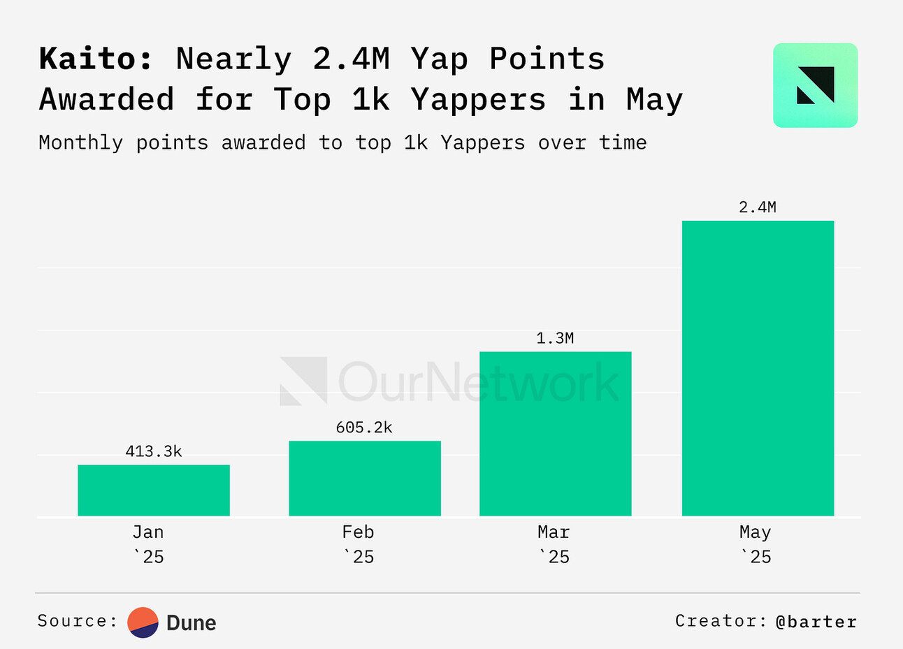 Kaito put the top 1,000 Yappers onchain via Ethereum Attestation System on Base, publishing usernames and Yap scores without linking wallets. Since then, their combined scores have grown by nearly a factor of five, as the 1,000 Yappers reached over 2.36M Yap points by May 2025. This highlights Kaito’s potential to become a core reputation layer in the future.