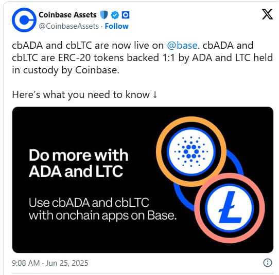 🚀 Coinbase Brings Cardano and Litecoin to Base, Joining DOGE and XRP:American cryptocurrency exchange Coinbase unveiled two new wrapped assets on Wednesday, making Cardano and Litecoin tradable on Base, the firm’s Ethereum layer-2 network.