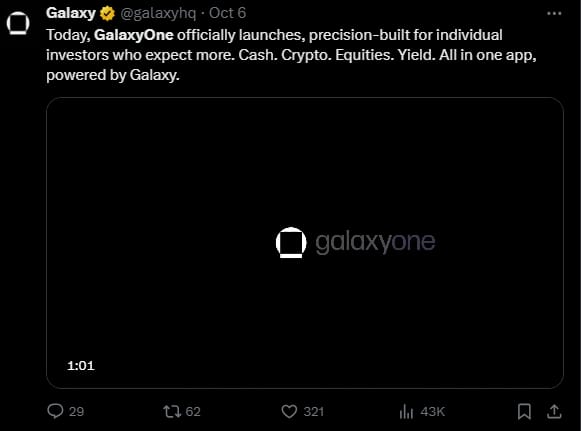 🏦Galaxy launches GalaxyOne platform offering crypto, stocks, and 8% yields to US users: Galaxy Digital on Monday rolled out GalaxyOne, a new consumer platform and app that combines a 4% cash account, crypto custody and trading, and zero-commission trading on U.S. equities and ETFs.