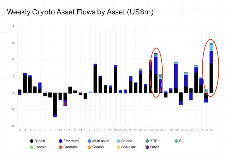 2. Nearly $6B flowed into digital assets last week, shattering the previous record set in July ($4.4B).