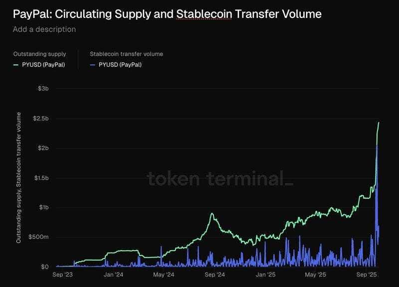 3. Quietly, PayPal PYUSD circulating supply has surged 113% month-over-month to reach a record $2.54B. The stablecoin now settles more than $6B in weekly transfers.