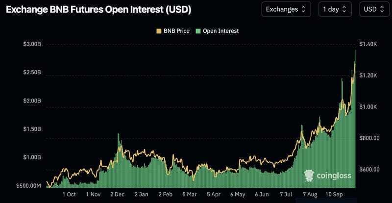 1. Open interest on BNB has swelled to an all-time high of $2.9B, more than doubling month-over-month. Meanwhile, the price of the underlying BNB has increased 46%.