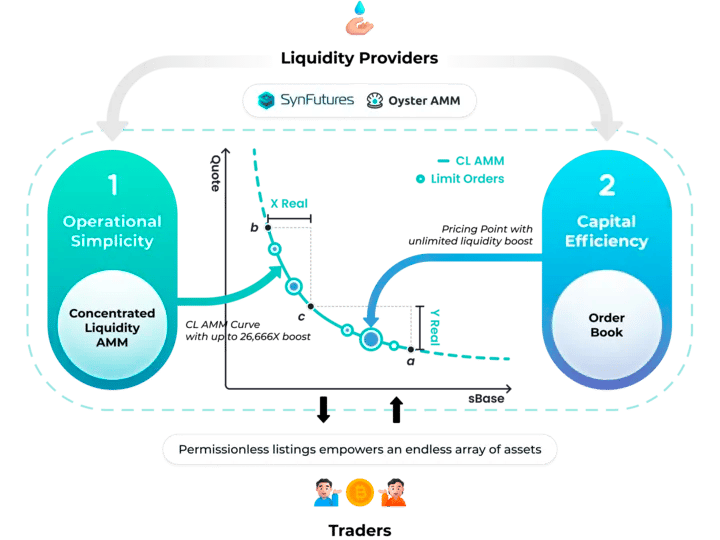 Oyster AMM combines the strengths of onchain order book and AMM models while allowing 30-second arbitrary asset listings of perps and futures with only a single token; it enables a significant “capital efficiency boost” and broadens SynFutures’ audience of traders and liquidity providers.