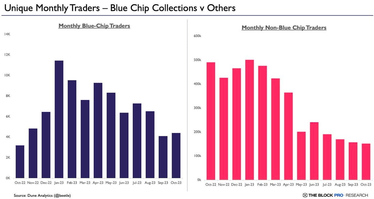2. Despite the market's overall decline, the number of unique traders in blue-chip NFTs rose by 8% in October, indicating a flight to quality within the NFT market.