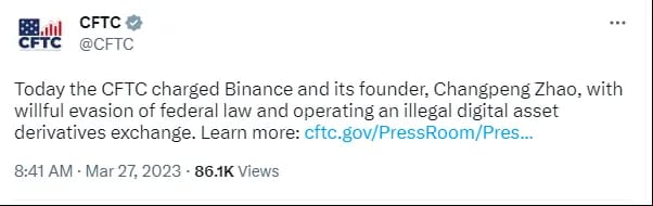 2.⚖️ Binance, CEO Zhao Sued by CFTC Over ‘Willful Evasion’ of U.S. Laws, Unregistered Crypto Derivatives Products- The U.S. Commodity Futures Trading Commission (CFTC) sued crypto exchange Binance and founder Changpeng Zhao Monday on allegations the company knowingly offered unregistered crypto derivatives products in the U.S. against federal law.