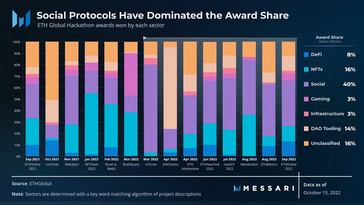 Now, aided by significant sponsorship from Aave’s Lens protocol and others, social projects are the majority of hackathon submissions with nearly 36% of all submissions since March 2022. Submitted social projects range from social media frontends and live-streaming platforms to niche features in the social stack. The increased development activity within Web3 social has helped push Lens engagements up 110% from its second month of operation through its sixth (September 2022). Even more than overall submissions, social protocols have dominated the share of awards since April’s LFGrow hackathon.