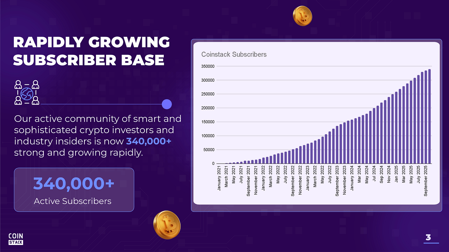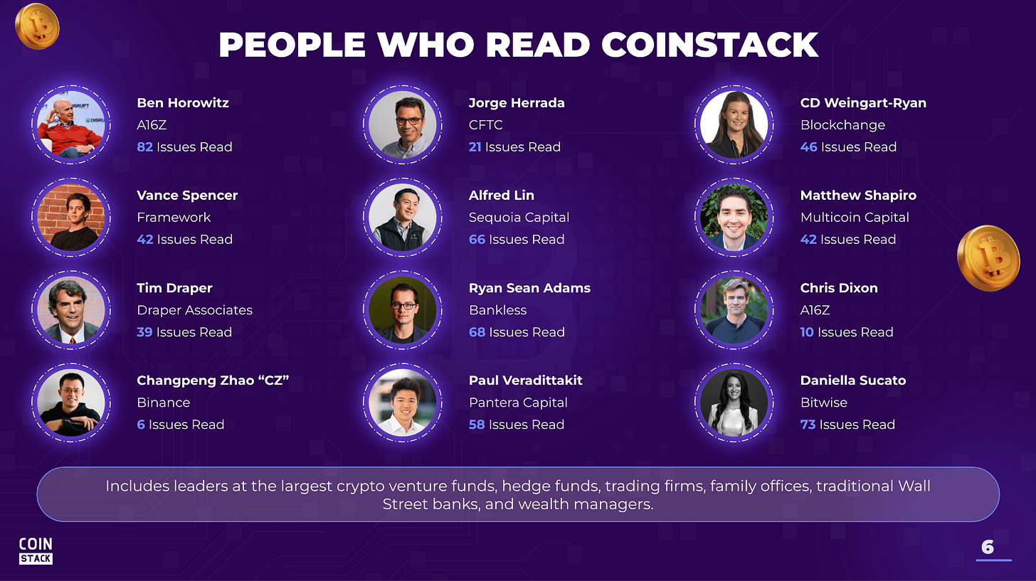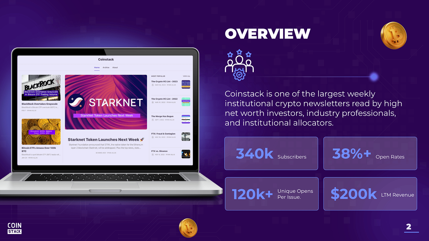 Over these five years, Coinstack has grown into one of the largest weekly institutional crypto newsletters with 340,000 subscribers and very strong open rates.