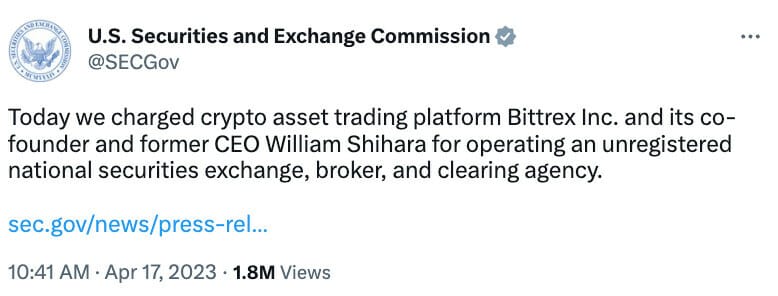 🔬 SEC Charges Crypto Asset Trading Platform Bittrex and Its Former CEO for Operating an Unregistered Exchange, Broker, and Clearing Agency- The Securities and Exchange Commission today charged crypto asset trading platform Bittrex, Inc. and its co-founder and former CEO William Shihara for operating an unregistered national securities exchange, broker, and clearing agency.