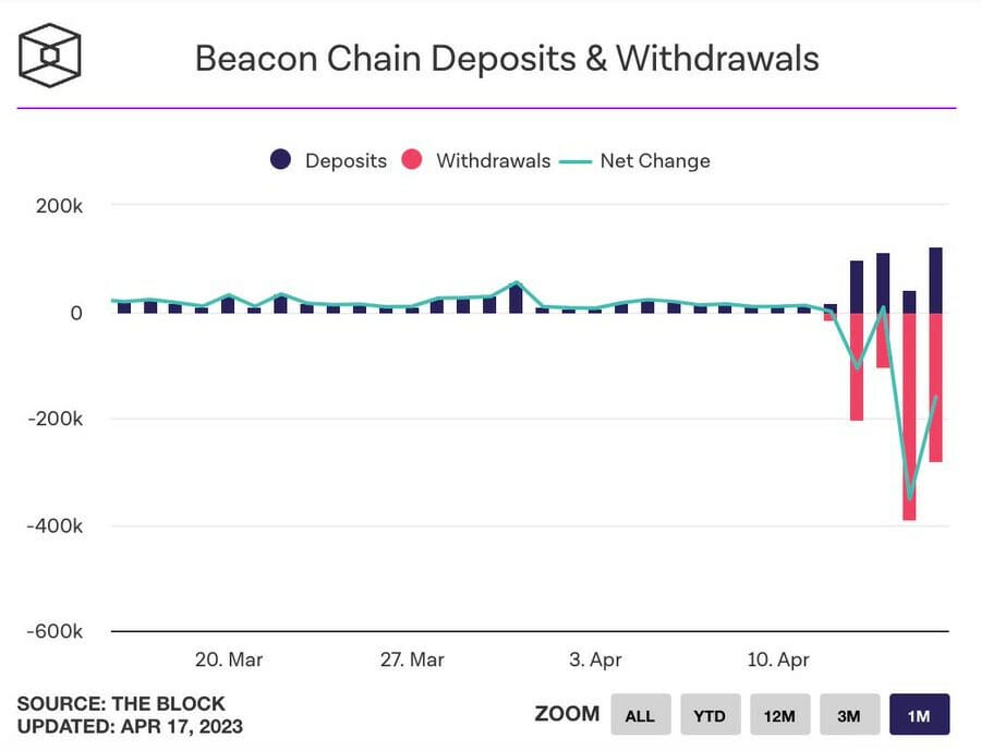 1. While there have been steady withdrawals now that they've been enabled, deposits have also risen a bit. Over 1 million ETH was withdrawn outpacing deposits the first few days.