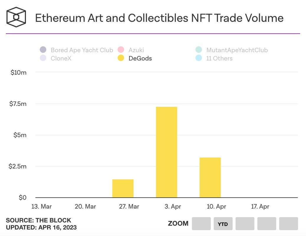3. DeGods had now been on Ethereum since Apr 1 after migrating from Solana. In the collection's first full week of trading it put up $7.24 mill in vol, exceeding the previous high on Solana by $220k.