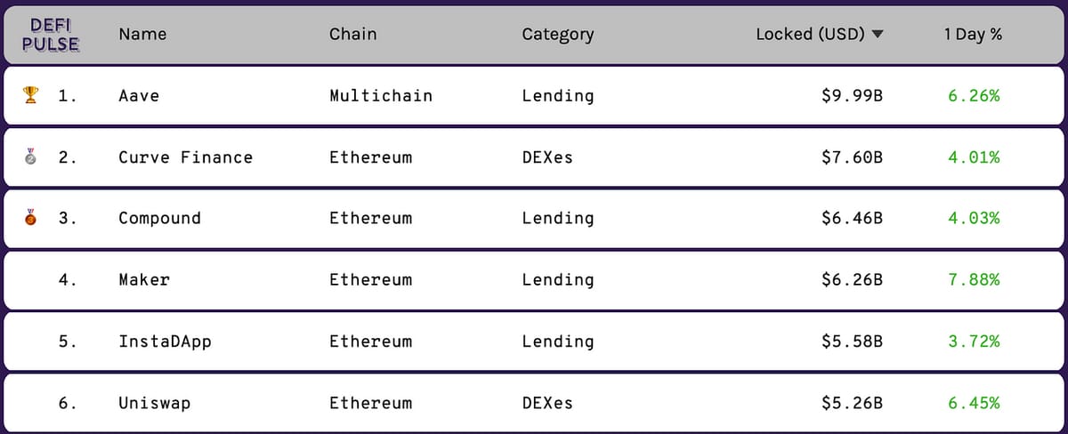 A Dapp is a decentralized application that runs on top of a smart contract platform like Ethereum, Solana, Binance Smart Chain, or Polakdot. The top Dapps right now on Ethereum are Aave, Curve, Compound, and Maker.