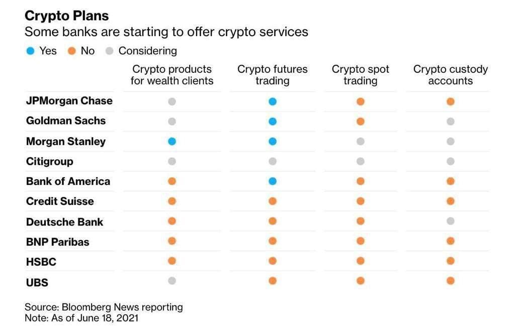 As you can see in the below table, JP Morgan Chase, Goldman Sachs, and Morgan Staley are in the lead within the traditional finance world with offering crypto offerings to their clients, with banks like Deutsche Bank, BNP Paribas, and HSBC still stuck with their heads in the sand.