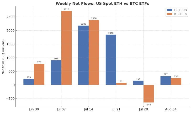 2. For the third consecutive week, ETH ETF inflows outpaced BTC ETFs: $327M compared to $253M.