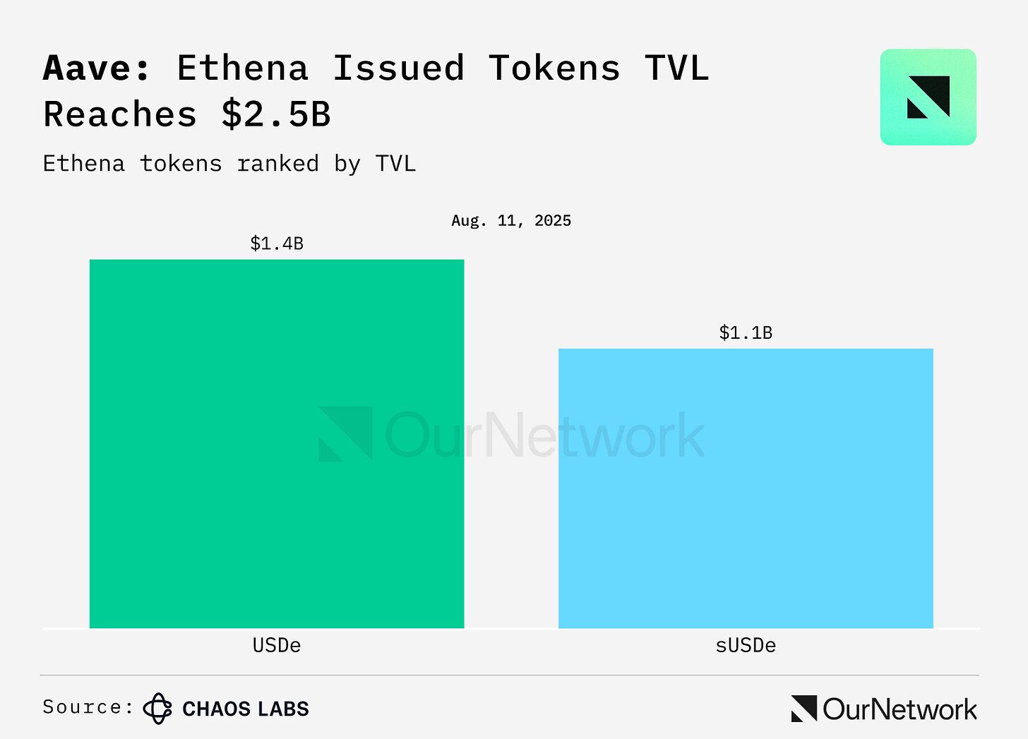 Ethena's sUSDe & USDe have seen sharp growth, driven by liquid leverage strategies on Aave. Users can supply a 50-50 sUSDe–USDe position, borrow against it, and recursively loop to amplify exposure, capturing the full staking yield. This dynamic has fueled demand for both assets.