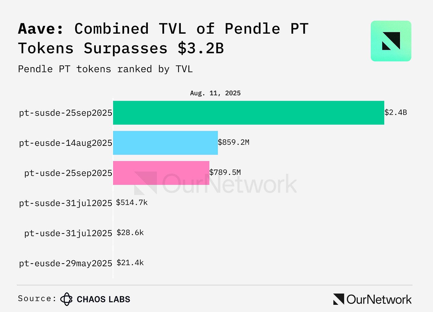 Pendle's PT tokens have amassed $3.2B in TVL on Aave, driven by Ethena-related assets and powered by Chaos Labs’ dynamic risk oracle, which enables real-time pricing and collateral adjustments to protect capital and support market efficiency.
