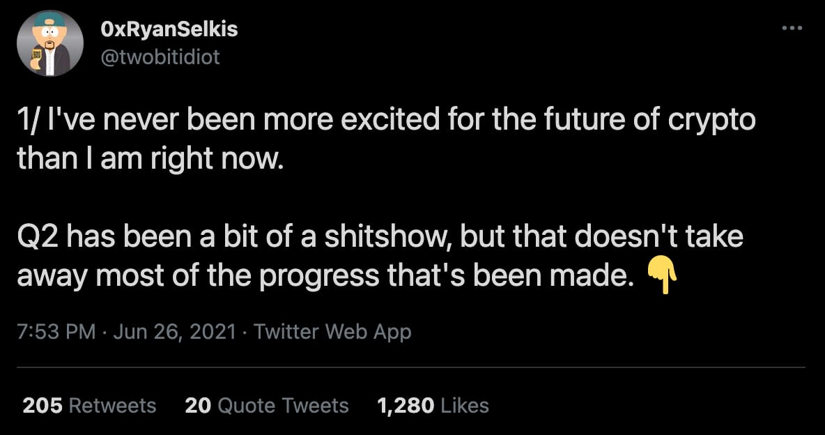 “I've never been more excited for the future of crypto than I am right now. Q2 has been a bit of a shitshow, but that doesn't take away most of the progress that's been made. 👇