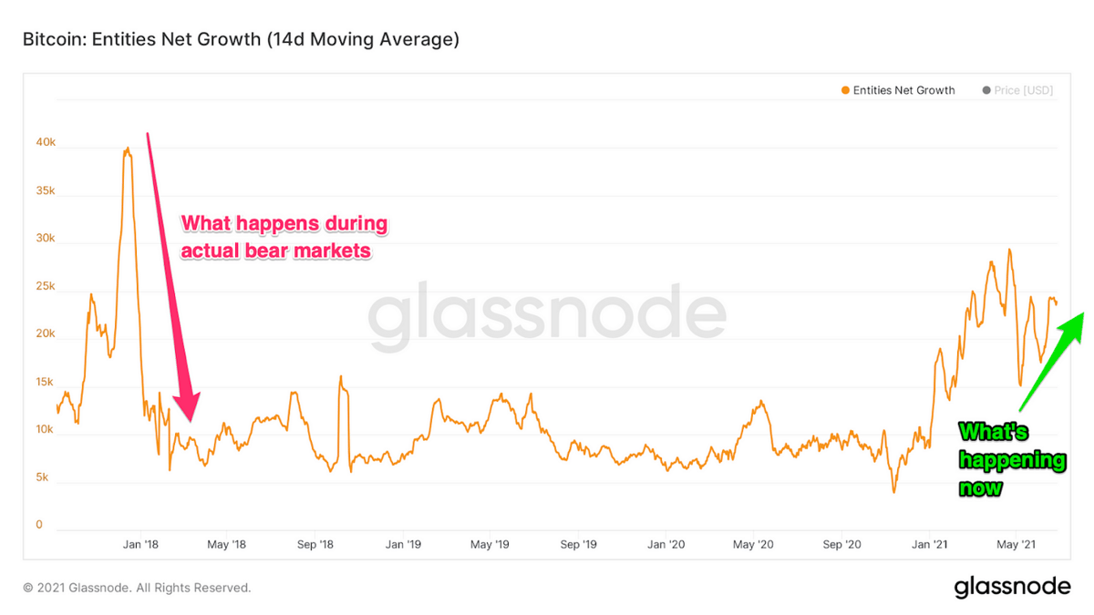 On-chain activity levels (more on that below) have recovered the last 2-3 weeks and are actually looking pretty good right now. If this were an actual bear market, they’d still be dropping. Take a look at this Bitcoin chart of Entities Net Growth from Glassnode…