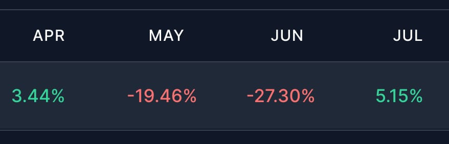 Our fund got creamed in May and June, but held up substantially better than many other crypto assets that experienced 50-70% drops. Below is the actual performance, which is always shown transparently and updated automatically every few minutes.