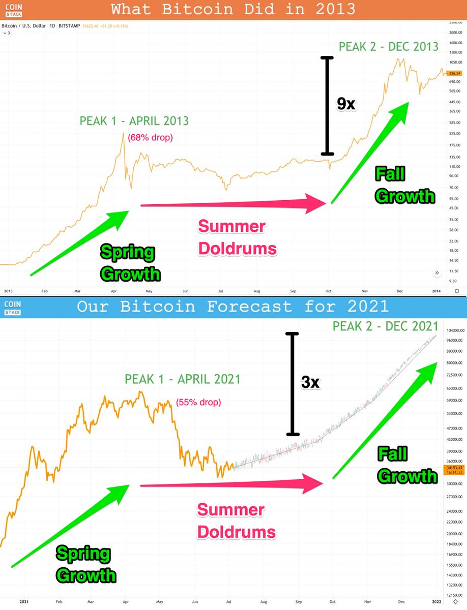 In 2013, Bitcoin went up 18x in the Spring, dropped 68% from its first peak into a period of consolidation over the summer, and then climbed another 9x in the Fall.