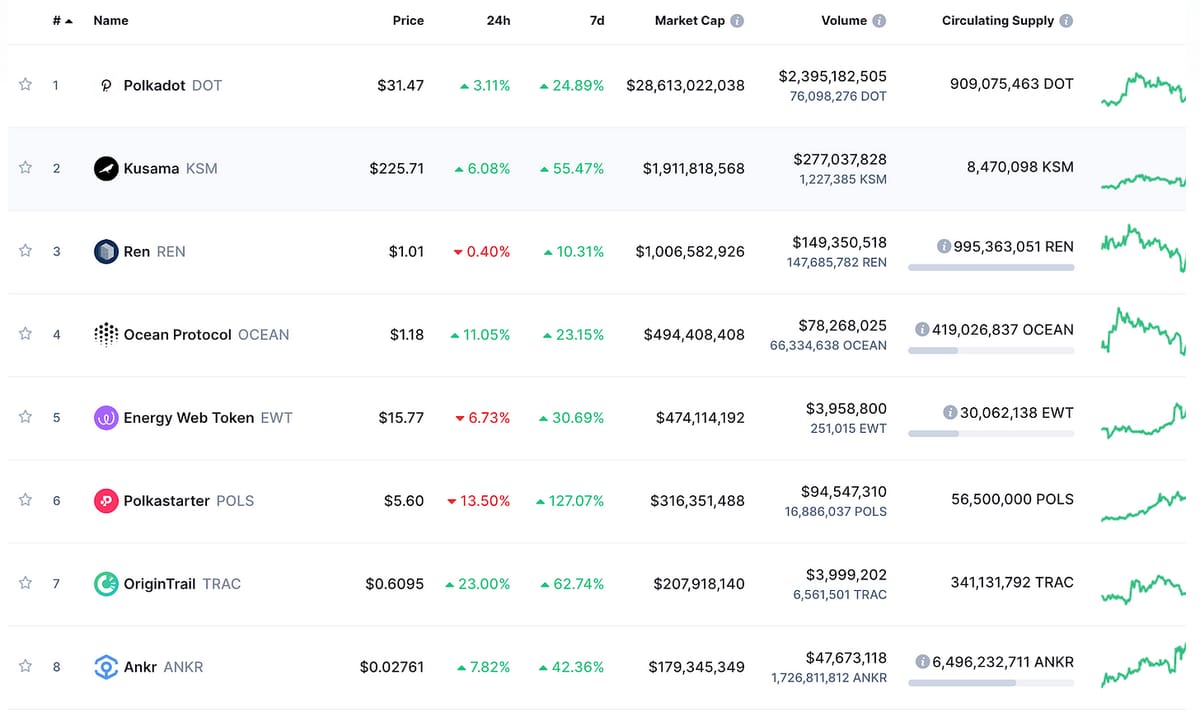In Saturday’s issue of The Coin Times, I wrote about Polkadot and Kusama and projects in their ecosystem like Polkastarter, Celer, and RioDeFi. I mentioned 12 tokens in total. On average, in the last week, these Polkadot ecosystem projects have increased in value by 60%. That’s 60% growth in one week. Had you put $10k in a week ago, you’d have $16,000 today.