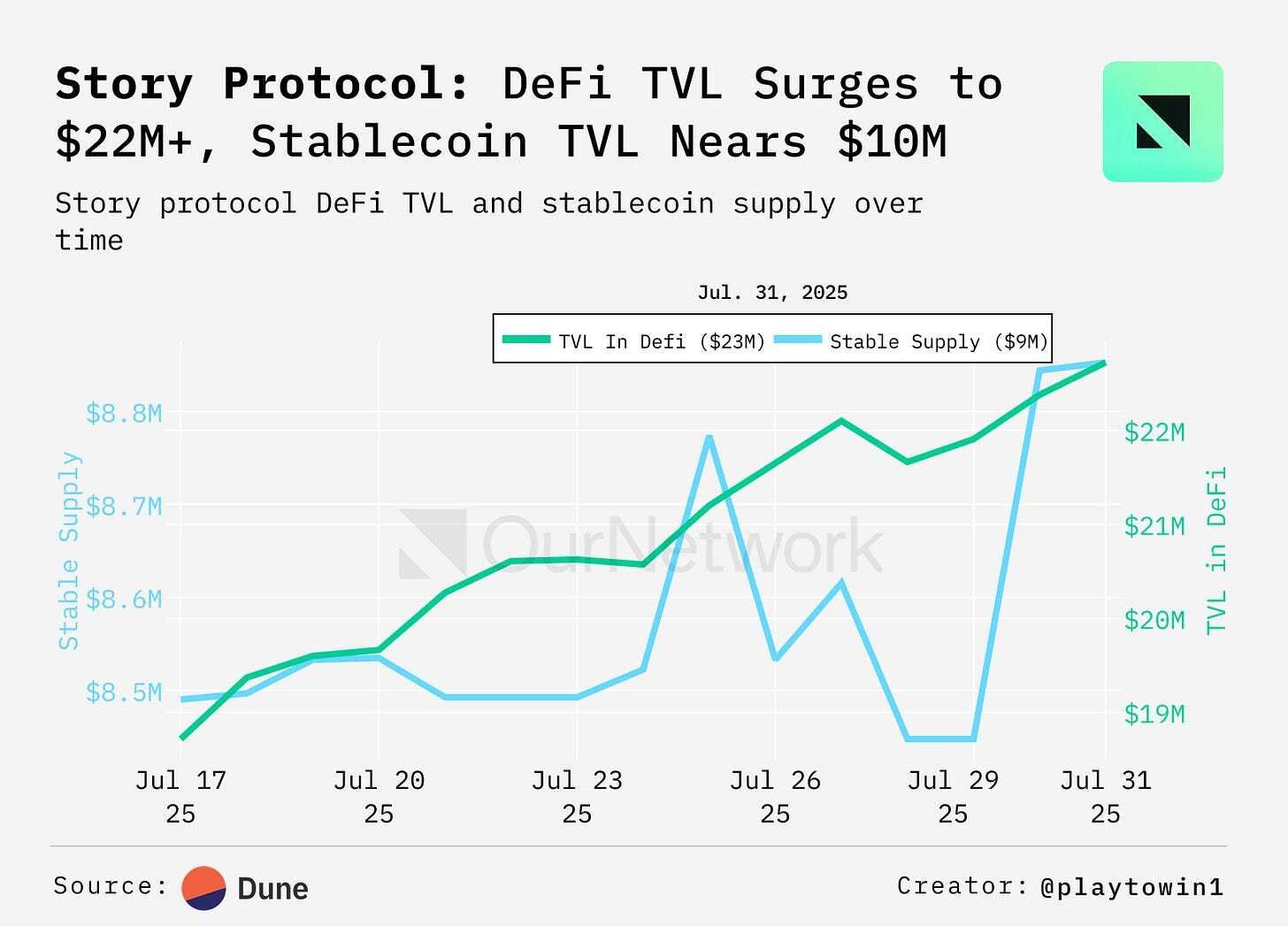 As of July 31, 2025, the Story network's stablecoin supply reached $8M, with DeFi TVL surging to $22M. The stablecoin supply primarily consists of USDC.e, bridged via Stargate, demonstrating growing adoption and liquidity in the ecosystem.