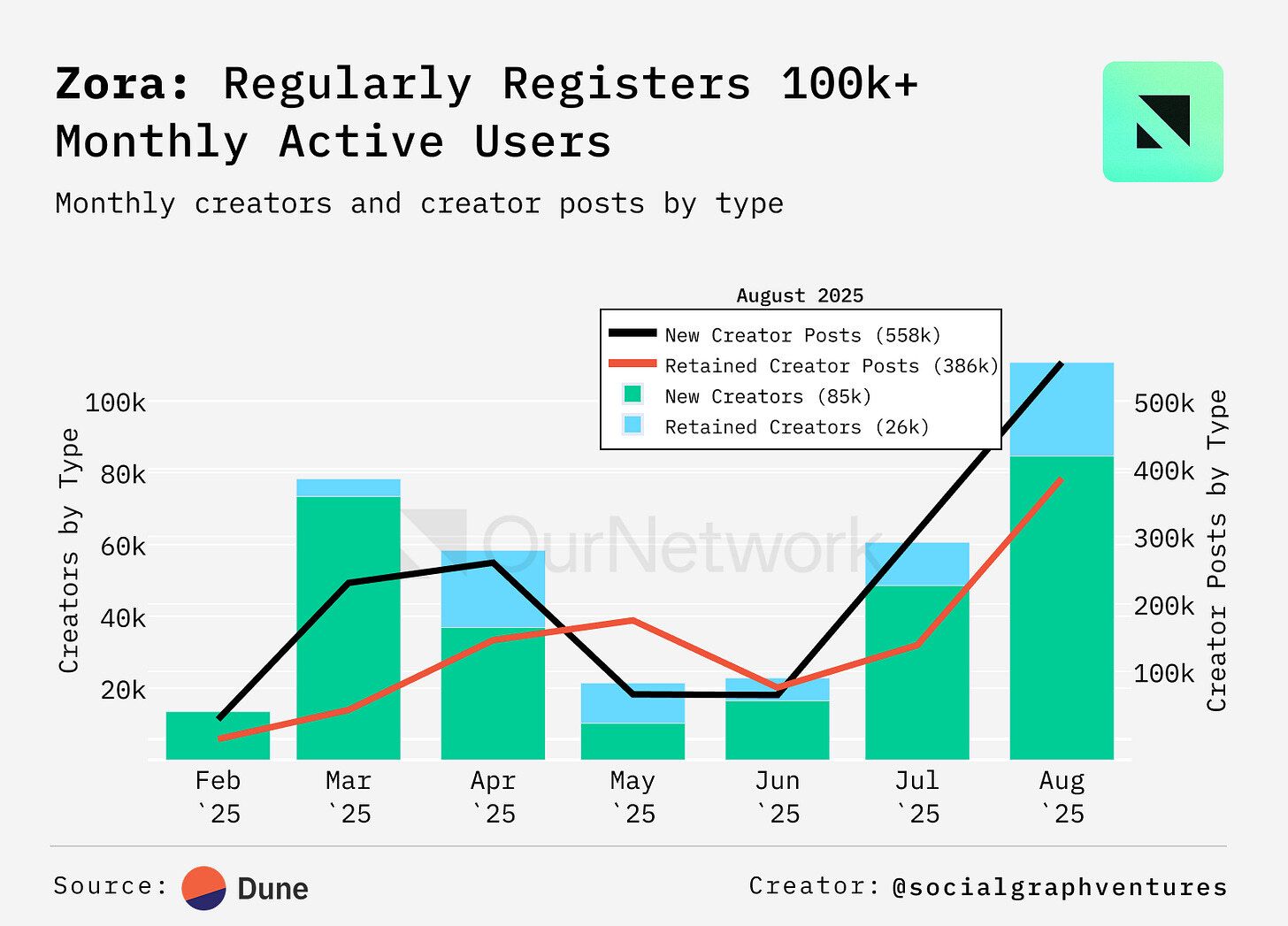4. Zora’s Gains Traction as Aggregate Coin FDV Surged Above $150M, Monthly Creators Topped 100k, and Revenue Hit $500k Per Week