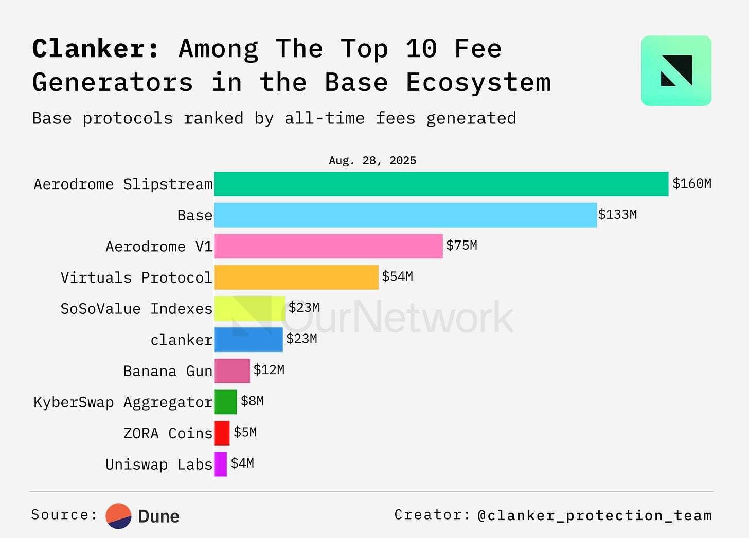 5. Clanker generated the sixth highest fees among apps in the Base ecosystem, trailing Aerodrome, Virtuals, and Base itself