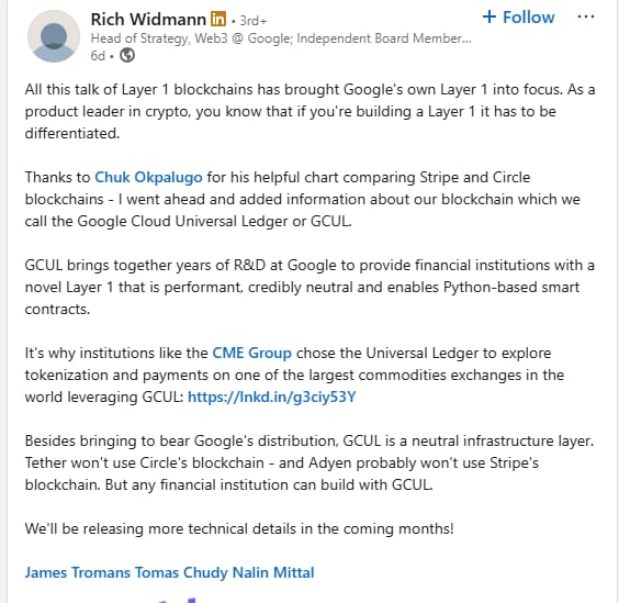 🎉Google Cloud is developing its own blockchain for payments, currently in private testnet:Google Cloud is building its own blockchain network, named Google Cloud Universal Ledger (GCUL), for the financial sector, according to Rich Widmann, Google Cloud's Web3 Head of Strategy, who announced this on Tuesday.