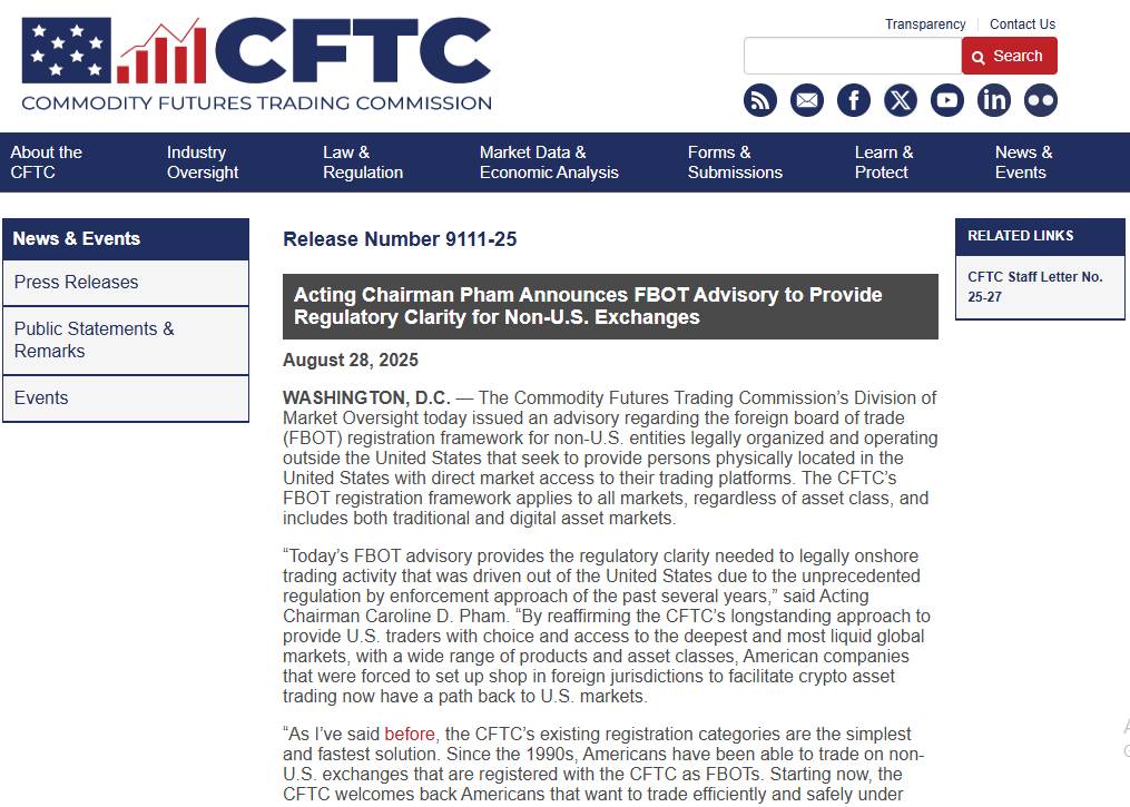 ⚖️ CFTC provides clarity on US access to foreign crypto exchanges after being 'driven out': The Commodity Futures Trading Commission clarified on Thursday that non-U.S. exchanges have a path that allows Americans to trade on their platforms, advancing its push toward being friendlier to the crypto industry under the Trump administration.