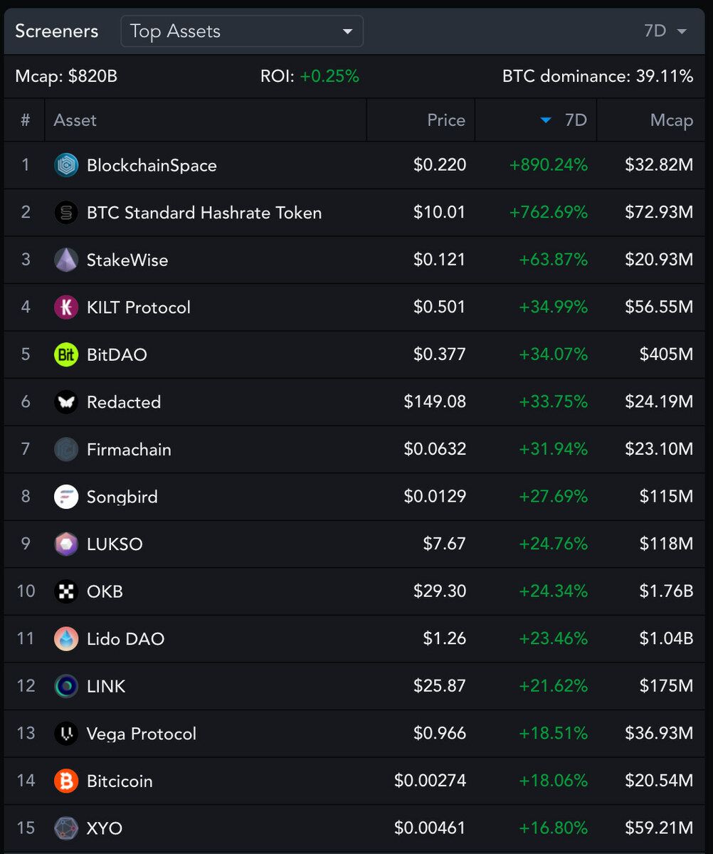Here are the top 15 performers in the last week from all tokens with a market cap of $20M+.