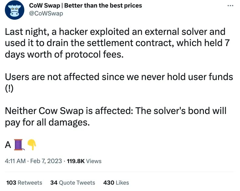 5) ⚠️ DEX Aggregator CoW Swap Falls Victim to $180k Hack- Decentralized exchange aggregator CoW Swap suffered a major hack, with the attacker making off with over $180,000 in funds, according to security firms PeckShield and BlockSec.